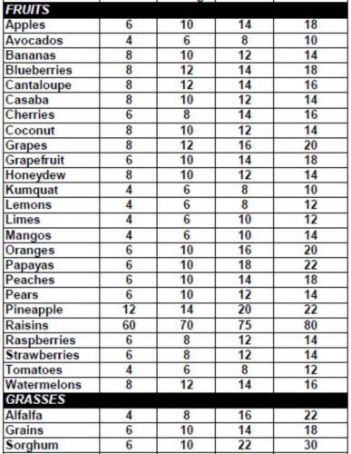 With your handy dandy little refractometer, you can check out the quality of your fruits and vegetables. Squeeze out some juice (use a garlic press for drier types) and take a look. Here is a chart of the refractive index of various plants as originally developed by Dr. Carey Reams and how their measured Brix level might rank.